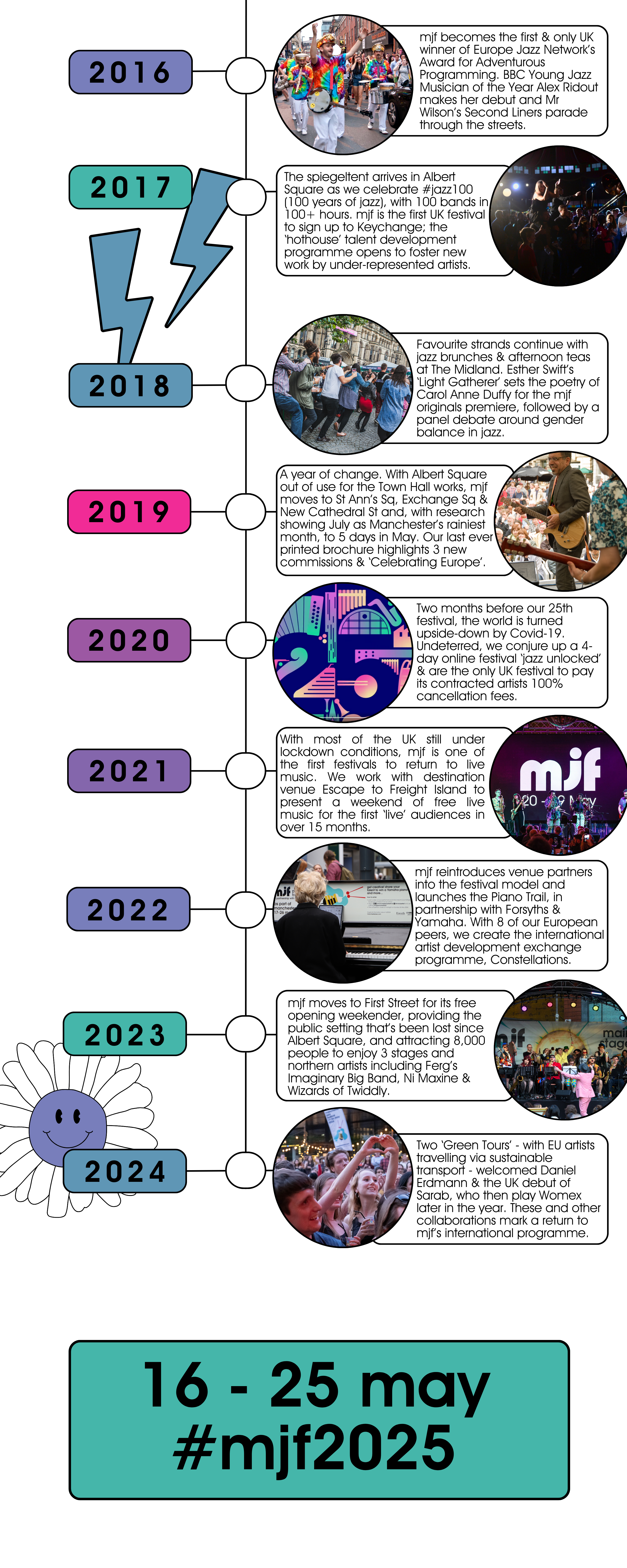 It’s fair to say that from this day in August, the festival has grown considerably into the 10 day event we know mjf to be. A festival working across multiple venues in Manchester and hosting a range of genre-pushing, contemporary, homegrown and international artists. But above all, mjf has stayed true to its ethos: a place for artists to find themselves, and for audiences to lose themselves.
